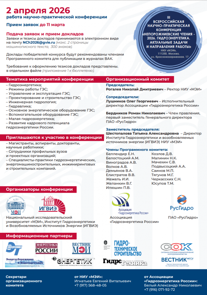 III ВСЕРОССИЙСКАЯ НАУЧНО-ПРАКТИЧЕСКАЯ КОНФЕРЕНЦИЯ «НЕПОРОЖНИЕВСКИЕ ЧТЕНИЯ — 2026. ГИДРОЭНЕРГЕТИКА. АКТУАЛЬНЫЕ ЗАДАЧИ И НАПРАВЛЕНИЯ РАБОТЫ» Автор: TechEdit | 31.03.2026 Нет комментариев Подача заявок и прием докладов Заявки и тезисы докладов принимаются в электронном виде на почту NCh2026@gvie.ru.